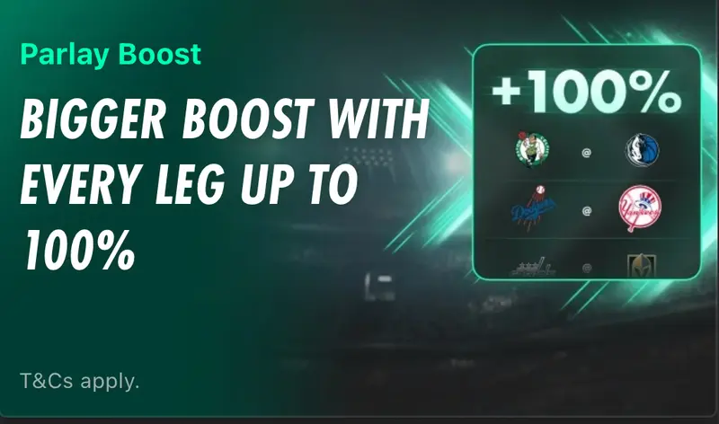 There’s also a parlay boost that’s good for anywhere from 2.5% all the way up to 100%. You build out a multi-leg wager of two or more legs on qualifying markets and receive a percentage boost based on the number of selections. For example, an eight-leg parlay gets you a 20% boost, while a huge 20-leg parlay comes with a 100% boost.