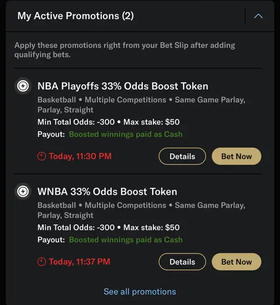 BetMGM regularly offers odds boosts on all of the top sports and events. Whenever you log in, check out the scrolling feed of promos above the main lobby. During a recent test run, there were odds boost tokens available for upcoming NFL, NBA, and NHL games. Just click to claim and receive a boost token of at least 25% that you can apply to your wager.