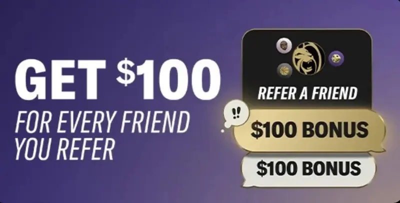If you bring a friend into the fold at BetMGM, there could be something in it for both of you. You can send a "refer a friend" invitation to up to five friends. If your referral claims a sign up bonus, registers for an account, deposits $100 or more, and places at least $100 worth of wagers at minimum of -200 odds, you'll both receive a $100 bonus.