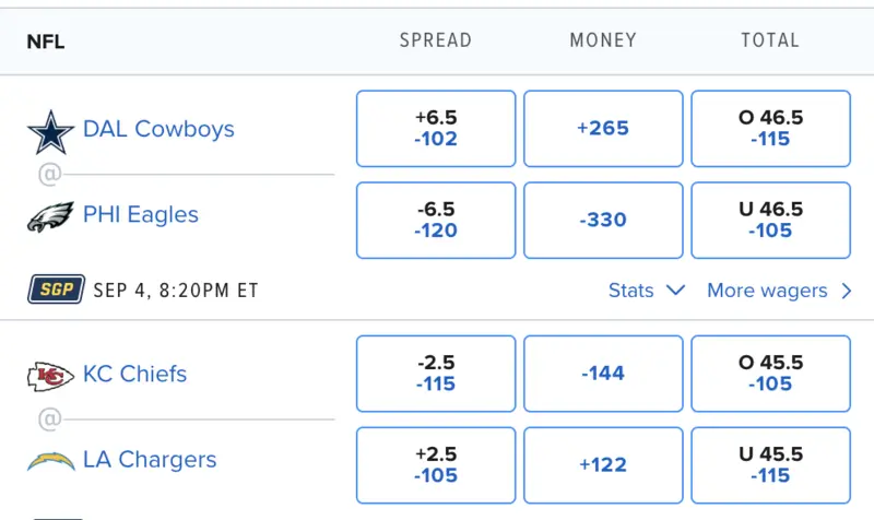 Next to the point spread is a number like -110 or -120. This number is the odds the betting app is charging to make the bet, often called the “vigorish” or “juice.” Since spread bets essentially level the playing field between two unevenly matched teams, a standard point spread bet has -110 odds for both sides. The vigorish, like the point spread, will fluctuate before the game depending on public betting patterns and other factors.