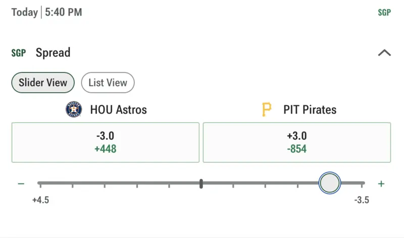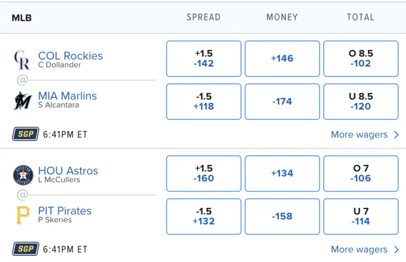 Baseball’s point spread, also known as “run line,” is set at -1.5 for the favorite and +1.5 for the underdog. Unlike basketball and football the run line is fairly static while the vigorish on it will change leading up to the first pitch.