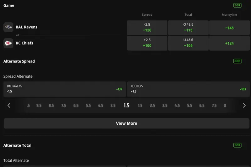 Using our Bears - Vikings example, if a bettor thinks Minnesota will blowout Chicago, they could take an even more extreme alt spread like Vikings are -6.5 and that new line might pay around +200. The further a bettor deviates away from the original point spread set by the oddsmaker, the more extreme the odds will get. It’s also an option to bet alt over/unders AKA "totals" set by betting apps in a similar manner.