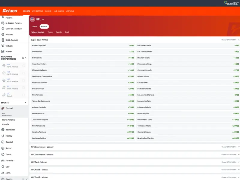 - Strong Futures market with Season Win Total and YES/NO Playoff options throughout the season