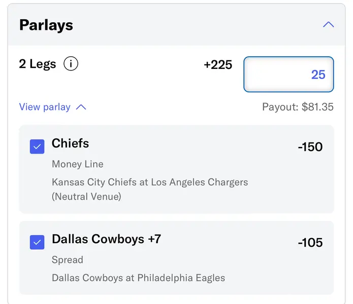 Traditional parlay bets involve combining the three most common types of bets (point spreads, over/unders, and moneylines), which can sometimes be started from a separate parlay builder screen, while other betting apps allow bettors to select parlay legs from the standard single bet screen. In both cases, parlays require 2+ legs and the math is calculated automatically for the bettor. The sportsbook you use will determine the type of parlays available and the maximum number of legs you can add. Some betting sites limit bettors to 10-leg parlays, while others set a 14-leg limit.