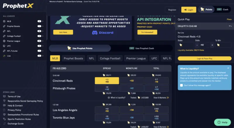 You may be interested in our complete review of Prophet X. Instead of wagering against the house and oddsmaker's lines, you make predictions based on odds listed at the exchange, or even set their own prices. There’s just a 3% percent commission rate (much better than the typical 10% sportsbook vig), giving you the chance to keep even more of your winnings. You can find MLB, NBA, NFL, and NHL lines (and others) on Prophet X.