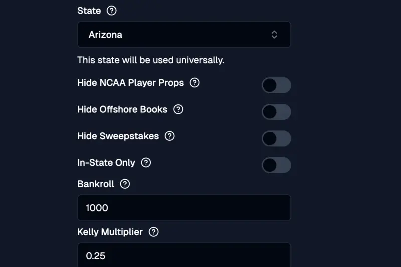 The first thing you'll want to do upon logging into Prop Professor is to customize it to your needs. In the upper right corner of the web page (to the left of the sign-out button) is a drop-down menu of states where you can select where you'll be betting from. Next, click settings in the bottom-left section of the screen and insert your bankroll size, which will be used to make appropriate betting recommendations. For instance, Prop Professor might suggest a $12 bet for someone with a smaller bankroll and a $120 bet on that same wager for someone with a larger bankroll.