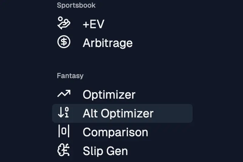 There are two main tools in the sportsbook version of the platform (+EV and Arbitrage) and four tools for the fantasy version (Optimizer, Alt Optimizer, Comparison, Slip Gen). All of these featured tools are found in the upper left section of the platform, no matter which page you're on. You can read more about each of these tools below in its appropriate section.