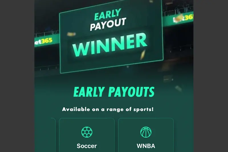 | ⏰ Early Payouts | With bet365's early payouts, you win once your team gets out to a big enough lead. Even if your team eventually loses the game, the money will already be in your account. For NBA games it's 20+ points, for NCAAB it's 15+ points, for soccer it's 2+ goals, MLB it's 5 runs, and hockey it's 3 goals. |